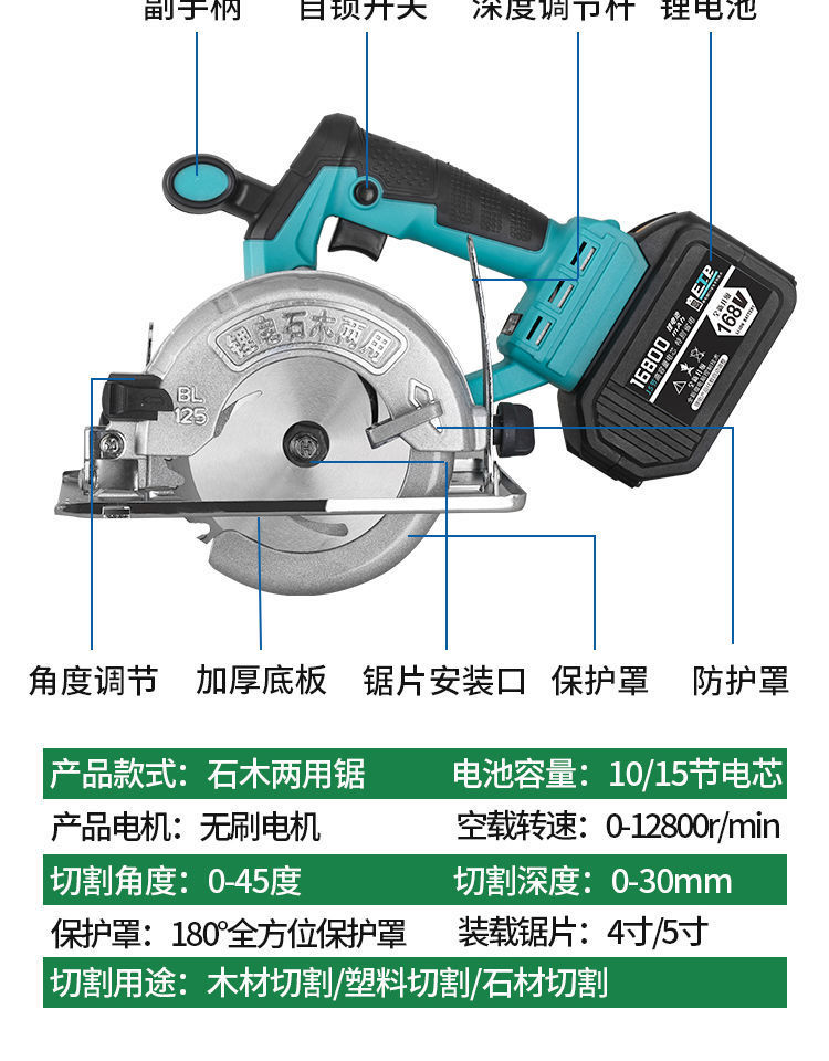 無刷鋰電圓鋸充電式石材切割機4寸木工雲石機5寸臺鋸手提圓盤電鋸