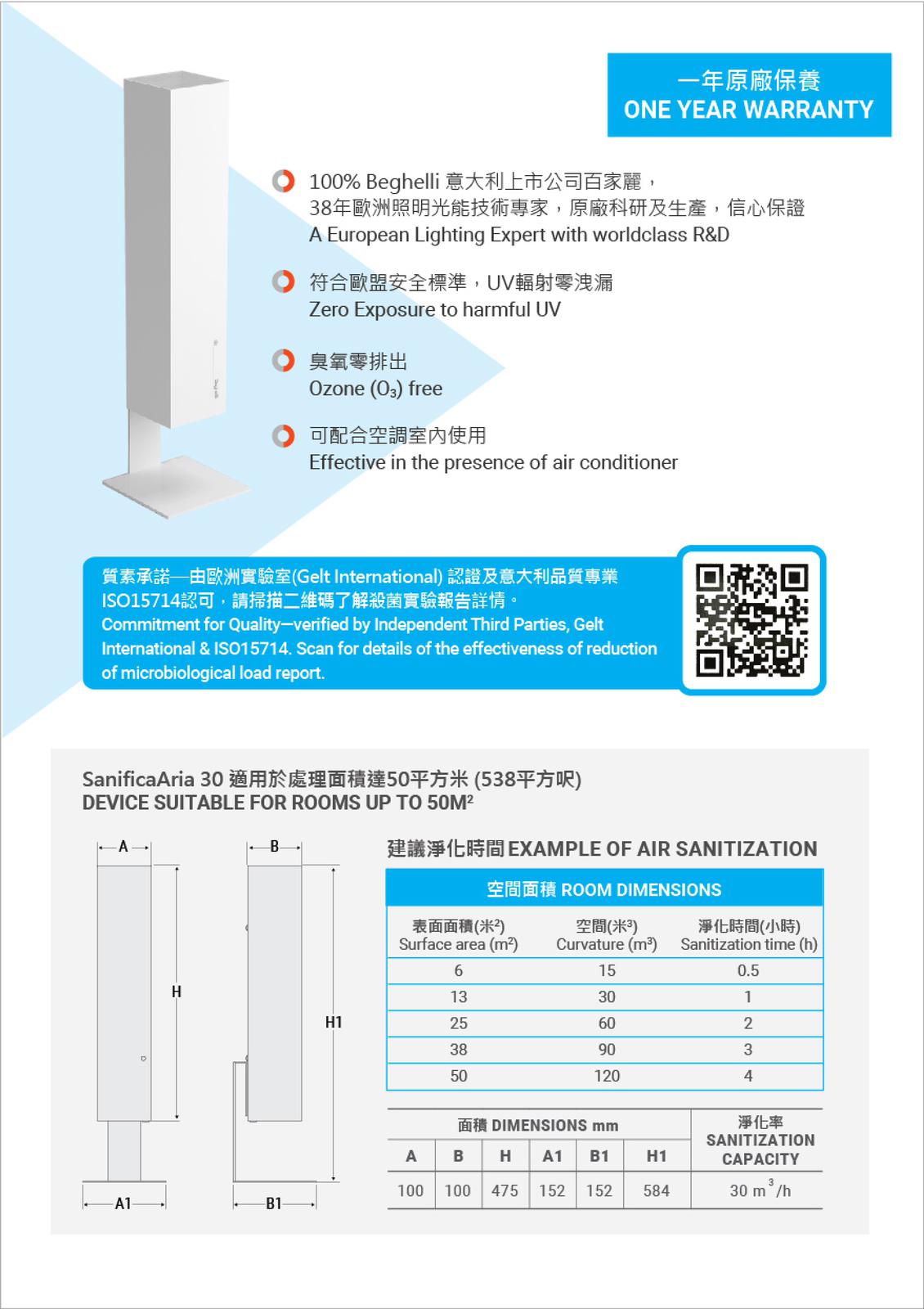 排放的空氣可減少多達99.9%的病毒和細菌, SanificaAria 設備的紫外線不會洩漏或接觸使用者,並防止在此過程中產生臭氧,對室內人和寵物安全,可安心長時間使用。SanificaAria非常適合在公共場所使用,例如醫院、酒店、學校、餐廳、辦公室、會所、零售店、酒吧和社區等等。