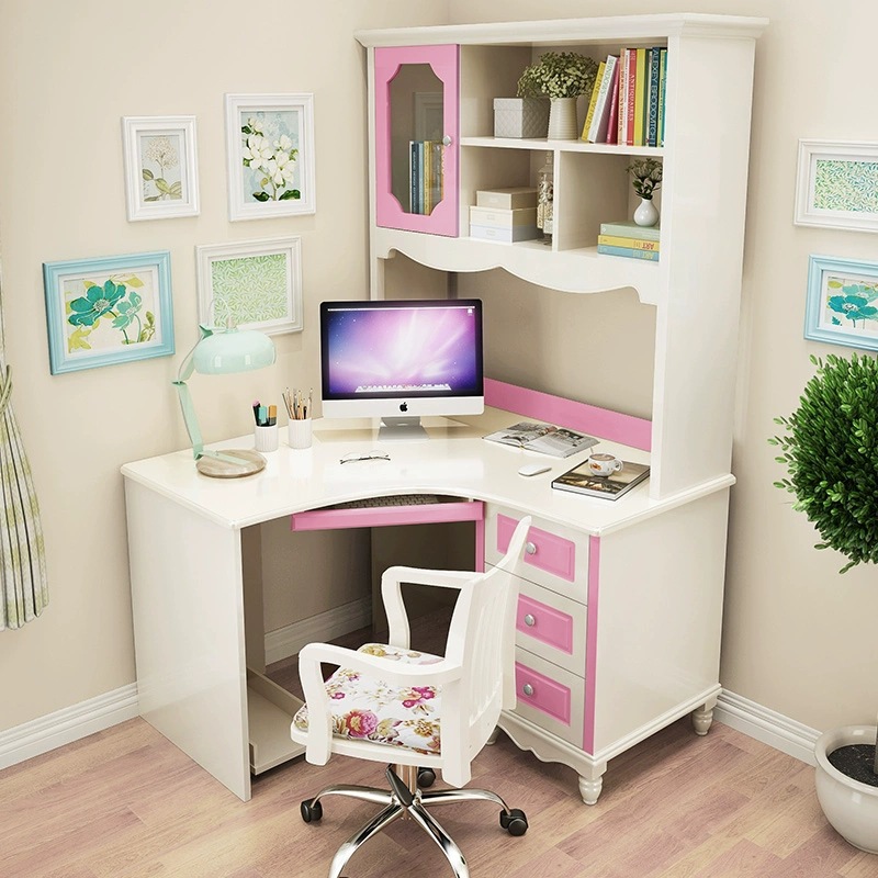 轉角書桌書架組合書房兒童書桌書櫃一體桌女孩粉色電腦桌臺式家用