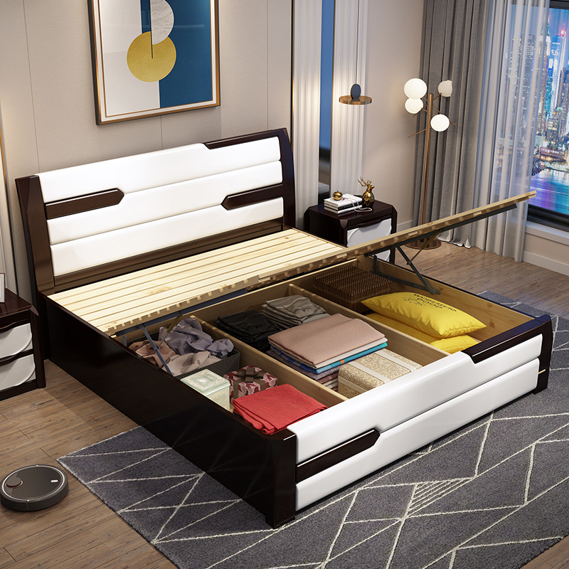 現代簡約實木牀 主臥室家用雙人大牀 1.8m1.5米高箱儲物全實木牀