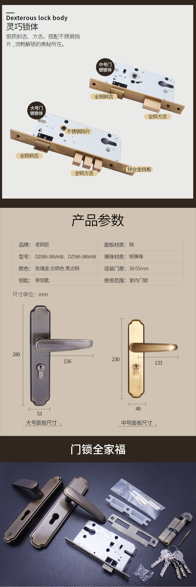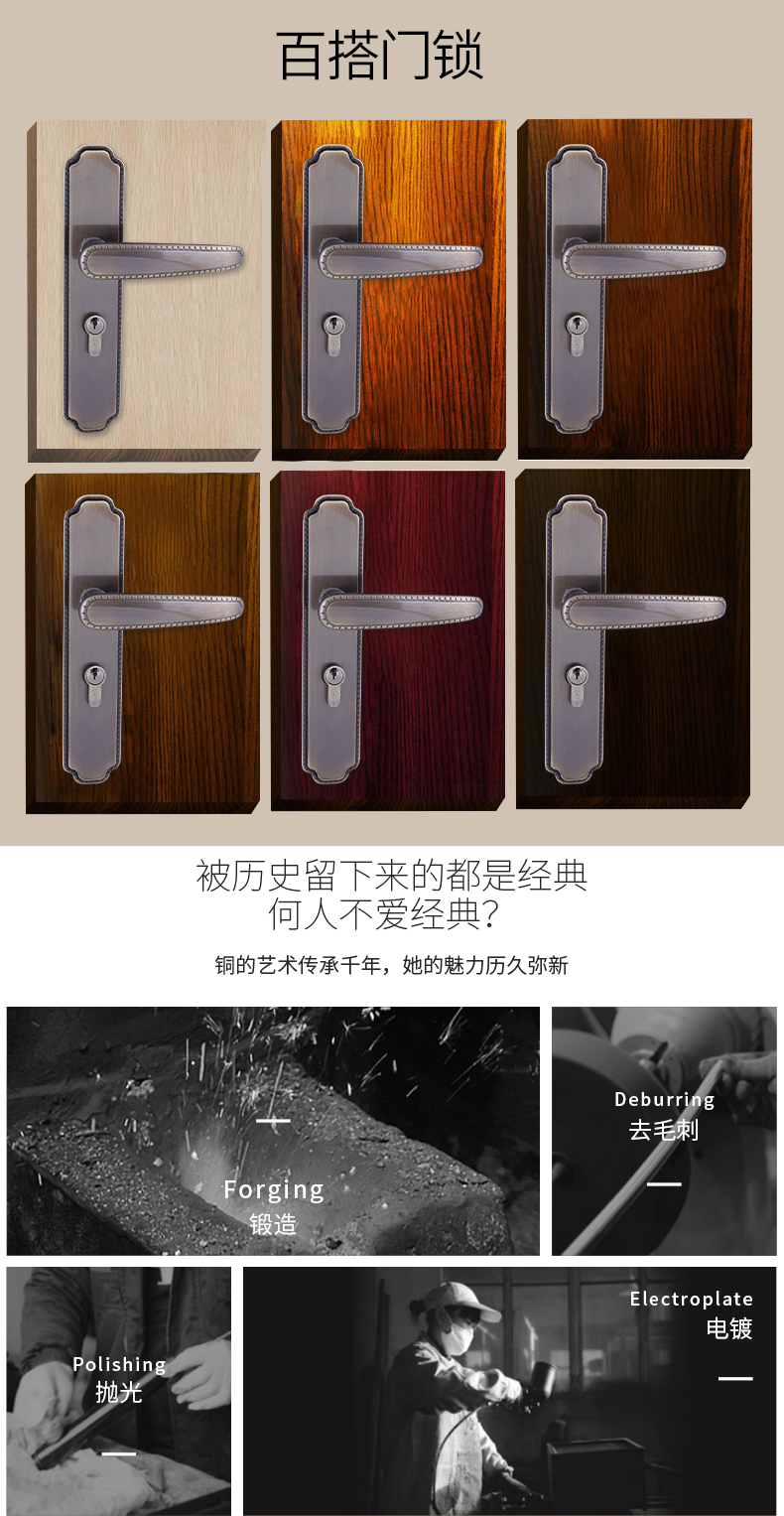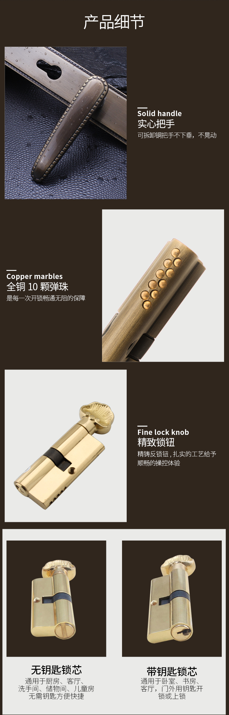 模帝樂防盜門鎖歐式全銅大門鎖復古把手面板通用型室內家用套裝
