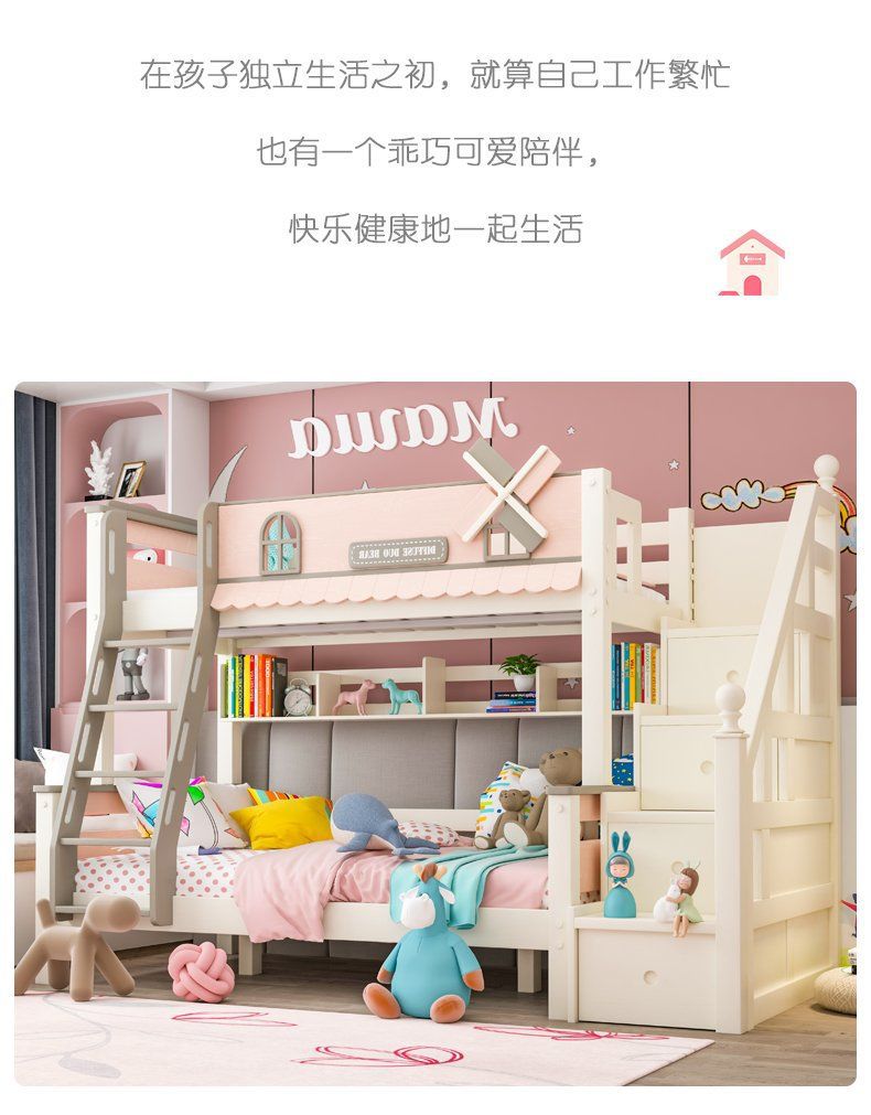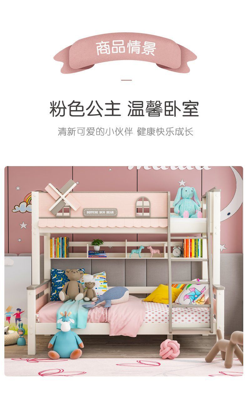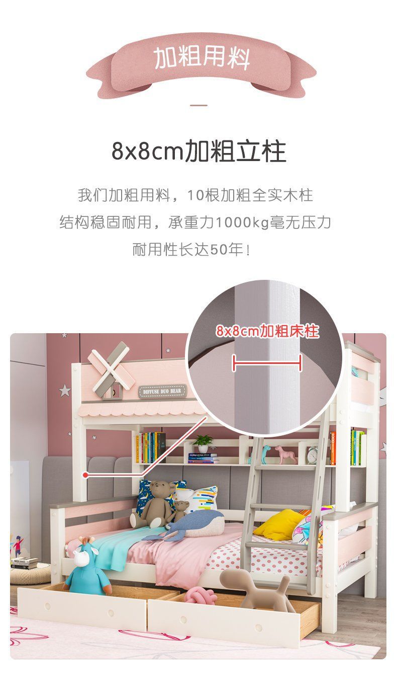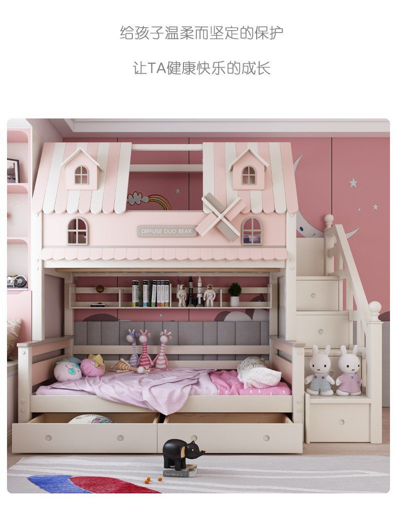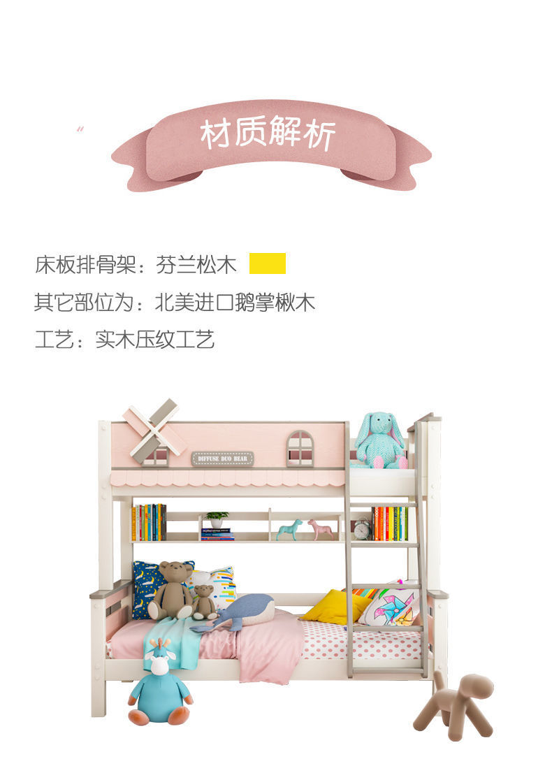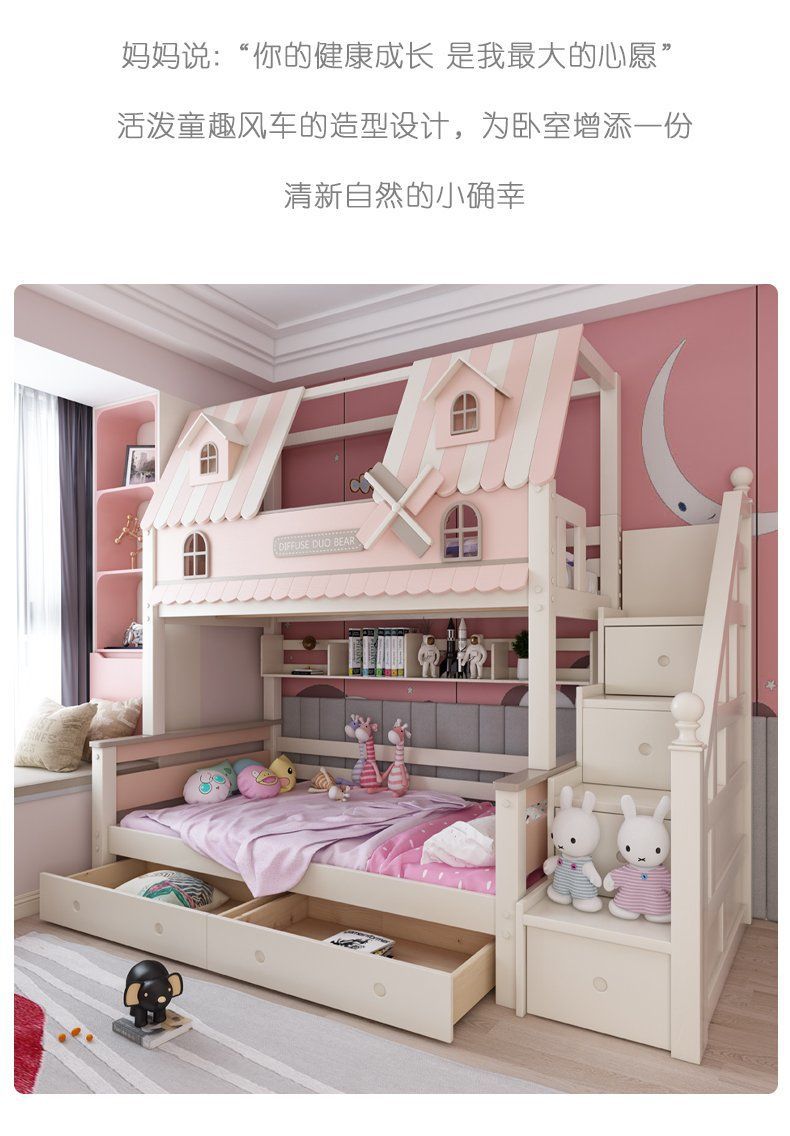 粉色公主牀上下牀風車子母牀城堡全實木高低上下鋪雙層女孩兒童牀