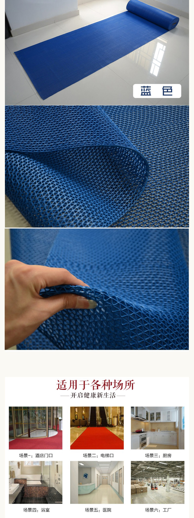 适用范围:主要用在仓库、车间、卫生通道、厨房、 餐厅走道、办公走廊、楼梯火车站、学校、商店、工厂办公室、宾馆、医院、飞机场、汽车站、公交车辆地板、旅游巴士车、高档级旅游车、各种船舶地板、汽车后备箱、天桥、运动场、海鲜池边、公共场所、幼儿园、老年活动中心、敬老院、体育场、儿童乐园、健身房、洗浴中心、展览通道、剪彩铺地、酒店大堂等,一般铺设在门道、过道、走廊、通道等需要防滑场所。