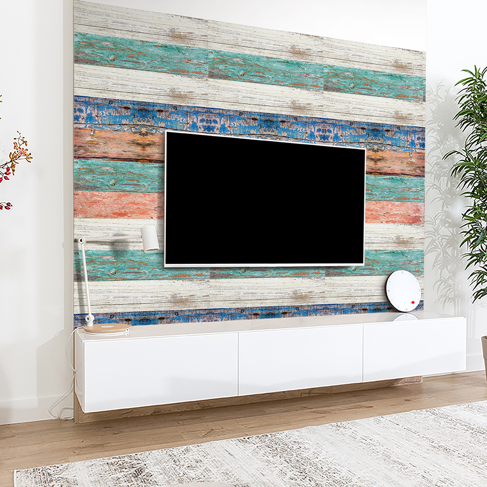 Funlife客廳沙發電視背景牆壁紙美式彩色仿木紋做舊自粘牆貼MF022