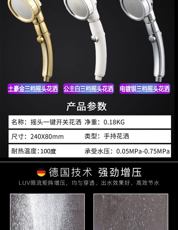 德國增壓帶開關淋浴花灑噴頭